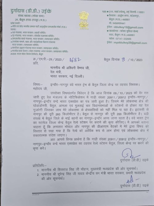 जैसे ही जानकारी लगी की वंदे भारत ट्रेन इंदौर से नागपुर तक चलने के आदेश हुए हैं वैसे ही संसद का एक पत्र सोशल मीडिया पर वायरल हो गया। इस पत्र में सांसद ने रेल मंत्री को लिखा है कि वंदे भारत एक्सप्रेस का बैतूल स्टापेज किया जाय। बात यह है कि अभी तक संसद न तो ट्रेन चलाने की मांग कर पाए और ना कोई ट्रेन का स्टॉपेज हो पाया है। जब वंदे भारत ट्रेन नागपुर तक चलने की जानकारी लगी तो सांसद ने तत्काल लेटर लिखकर सोशल मीडिया पर वायरल कर दिया ताकि वंदे भारत ट्रेन का श्रेय सांसद को मिल सके। जब ट्रेन के आदेश आये तो सांसद की नींद खुली। खैर जो भी हो इस पत्र का कोई मतलब नही है। इनके पत्र लिखने से कोई फर्क नही पड़ता है। ट्रेन समय के साथ आने वाले दिनों में वैसे भी बैतूल में रुकेगी।