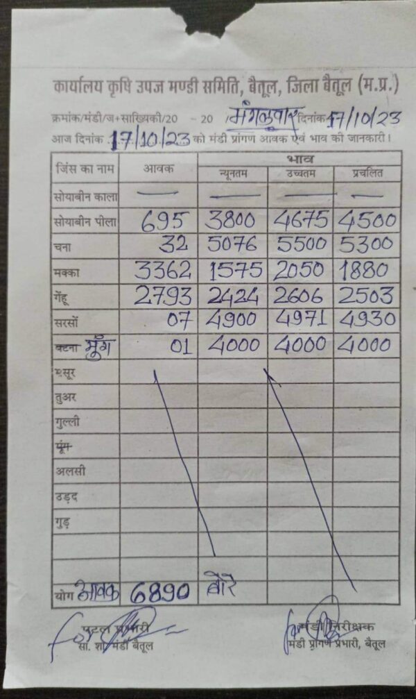 Betul Mandi Bhav 17 October 2023: मंगलवार को मंडी में खरीदी हुई। बैतूल मंडी में उपज की आवक में फिर से कमी आई है। उपज के दामों में भी उतार चढ़ाव देखने को मिल रहा है। मंगलवार को बैतूल मंडी में कुल उपज की आवक 6 हजार 890 बोरे रही। सबसे ज्यादा 2 हजार 793 बोरे आवक गेंहू की आवक रही। सोयाबीन की आवक 695 बोरे रही। इन दिनों मंडी में फसलों के दाम भी कम है।