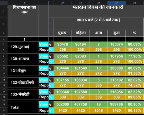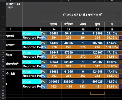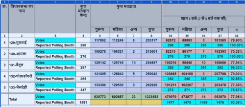 मुलताई में 52.10 प्रतिशत है। आमला 47.67 प्रतिशत है। बैतूल 47.12 प्रतिशत, घोड़ाडोंगरी 49.85 प्रतिशत , भैंसदेही 47.41 प्रतिशत मतदान हुआ। जिले का कुल मतदान प्रतिशत 48.80 प्रतिशत है।