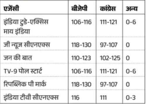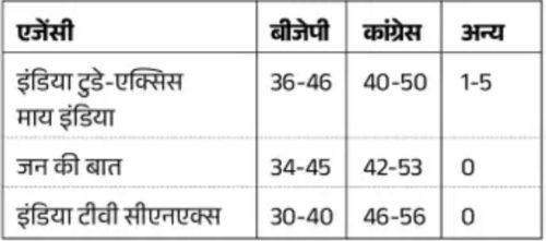 इधर छत्तीसगढ़ राज्य में भाजपा और कांग्रेस के बीच काटे की टक्कर है। हालांकि छत्तीसगढ़ में अधिकतम न्यूज़ चैनल अपने सर्वे में कांग्रेस को बहुमत मिलना दिखा रहे। इंडिया टुडे एक्सेस माय इंडिया के एग्जिट पोल में भाजपा को 36 से 46 और कांग्रेस को 40 से 50 सीटे मिलना बता रहे है। छत्तीसगढ़ में कुल 90 सीटे हैं जिसमें जीत के लिए 46 सीटे मिलना जरूरी है।