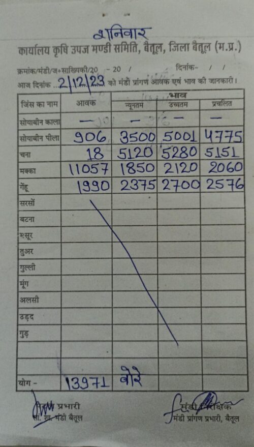 Betul Mandi Bhav 2 December 2023: शनिवार को मंडी में खरीदी हुई। उपज के दामों में भी उतार चढ़ाव देखने को मिल रहा है। शनिवार 2 दिसंबर 2023 को बैतूल मंडी में कुल उपज की आवक 13 हजार 971 बोरे रही। 1 हजार 990 बोरे आवक गेंहू की आवक रही। सोयाबीन की आवक 906 बोरे , मक्का की आवक 11 हजार 57 बोरे रही। इन दिनों मंडी में फसलों के दाम भी कम है।