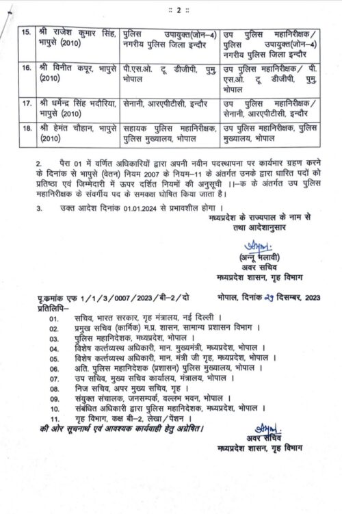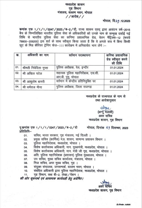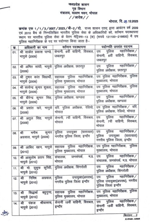 Mp Police Transfer: मध्य प्रदेश में डॉक्टर मोहन यादव के मुख्यमंत्री बनने के बाद पहली बार अपने पुलिस अधिकारियों को पदोन्नति कि है। जारी आदेश में राज्य शासन एतद् द्वारा आवंटन वर्ष 2009 एवं 2010 बैच के निम्नलिखित भारतीय पुलिस सेवा के अधिकारियों को वर्तमान पदस्थापना स्थान पर भारतीय पुलिस सेवा के वेतन मेट्रिक्स-13 (क) (रूपये 131100-216600) में उप पुलिस महानिरीक्षक के पद पर पदोन्नत किया है।