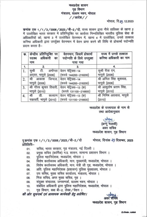 राज्य शासन द्वारा नीचे तालिका के खाना 2 में उल्लेखित भारत सरकार में प्रतिनियुक्ति पर कार्यरत निम्नलिखित भारतीय पुलिस सेवा के अधिकारियों को खाना 3 में उल्लेखित वेतनमान में, खाना 4 में उल्लेखित उनसे तत्काल कनिष्ठ अधिकारी द्वारा उपर्युक्त वेतनमान में वेतन प्राप्त करने की तिथि से प्रोफार्मा पदोन्नति प्रदान करता है।