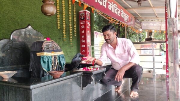 Betul Today News: बैतूल गुरुवार सुबह बीएसएनएल कार्यालय के ठीक बाजू में बने शनि मंदिर में श्रद्धालुओं के आश्चर्य का उस समय ठिकाना नहीं रहा जब शनि भगवान की साक्षात सवारी एक कौआ शनि भगवान के चबूतरे पर भगवान के चरणों मे बैठा नजर आया। आश्चर्य इस बात का भी है जब श्रद्धालु पूजन पाठ करते रहे और इस दौरान कौआ अपनी जगह पर आराम से बैठा रहा। कौवा अपनी जगह से उड़ भी नहीं रहा था। बताया जा रहा है कि करीब दो घण्टे तक यह कौवा भगवान शनि देव के पास बैठा  रहा और कुछ देर बाद उड़कर कहाँ चला गया किसी को पता नहीं चला।