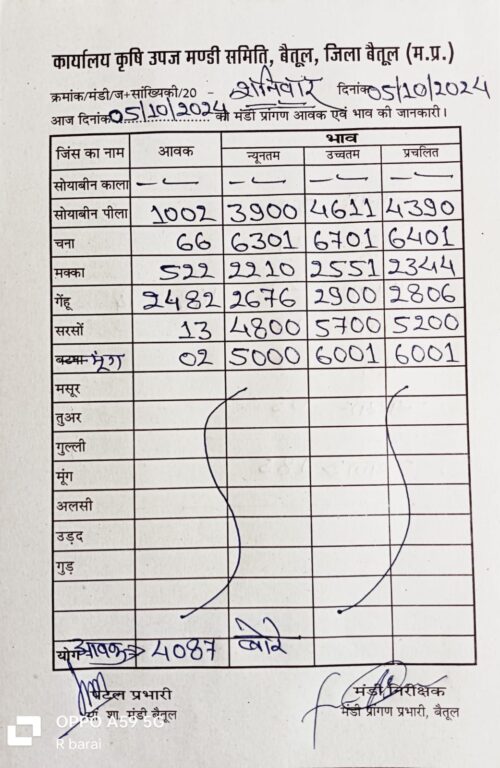 Betul Mandi Bhav 05 October 2024 : शनिवार को मंडी में खरीदी हुई। उपज के दामों में भी उतार चढ़ाव देखने को मिल रहा है। 05 अक्टूबर 2024 को बैतूल मंडी में कुल उपज की आवक 4 हजार 87 बोरे रही। 2482 बोरे आवक गेंहू की आवक रही। सोयाबीन की आवक 1002 बोरे , मक्का की आवक 522 बोरे रही। इन दिनों मंडी में फसलों के दाम भी कम है।