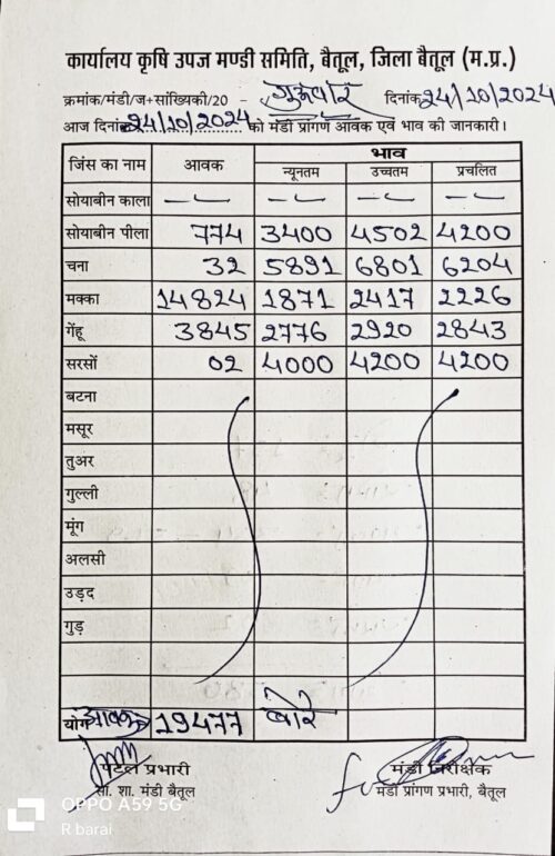 Betul Mandi Bhav 24 October 2024  : गुरुवार को मंडी में खरीदी हुई।  उपज के दामों में भी उतार चढ़ाव देखने को मिल रहा है। 24 अक्टूबर  2024  को बैतूल मंडी में कुल उपज की आवक 19 हजार 477 बोरे रही। 3044 बोरे आवक गेंहू की आवक रही। सोयाबीन की आवक 774 बोरे , मक्का की आवक 14824 बोरे रही। इन दिनों मंडी में फसलों के दाम भी कम है।