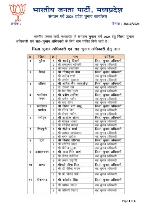 मध्य प्रदेश भाजपा शहर चुनाव प्रभारी के नाम की लिस्ट भी जारी की है।