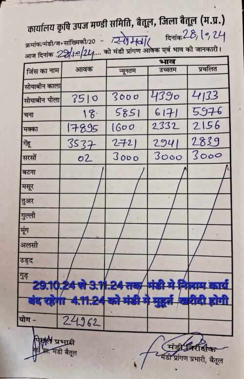 Betul Mandi Bhav 28 October 2024 : Betul Mandi Bhav today 28 October 2024, purchase will remain closed for the next 6 days