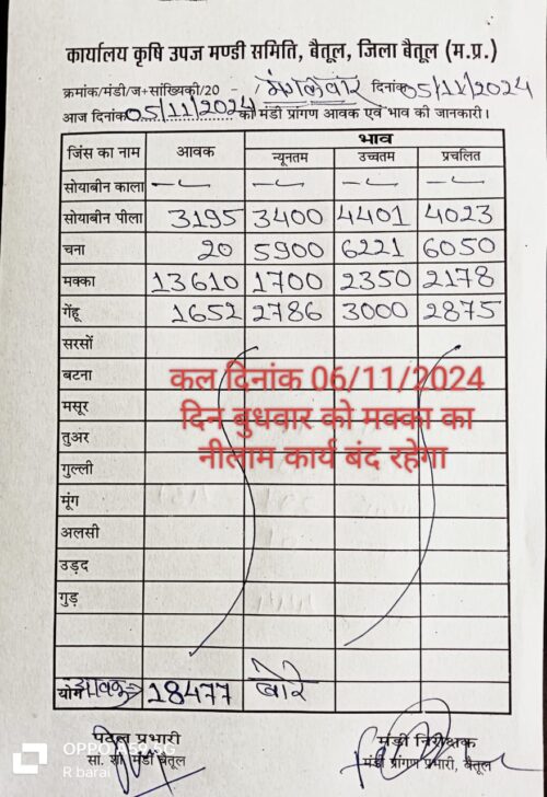 Betul Mandi Bhav 05 November 2024  : मंगलवार को मंडी में खरीदी हुई।  उपज के दामों में भी उतार चढ़ाव देखने को मिल रहा है। 5 नवम्बर  2024  को बैतूल मंडी में कुल उपज की आवक 18 हजार 477 बोरे रही। 1652 बोरे आवक गेंहू की आवक रही। सोयाबीन की आवक 3195 बोरे , मक्का की आवक 13610 बोरे रही। इन दिनों मंडी में फसलों के दाम भी कम है। 6 नवम्बर 2024 को मंडी में खरीदी बंद रहेगी।