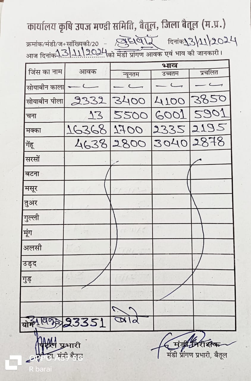 Betul Mandi Bhav 13 November 2024 : आज 13 नवंबर 2024 के बैतूल मंडी भाव, 23 हजार बोरे रही उपज की आवक