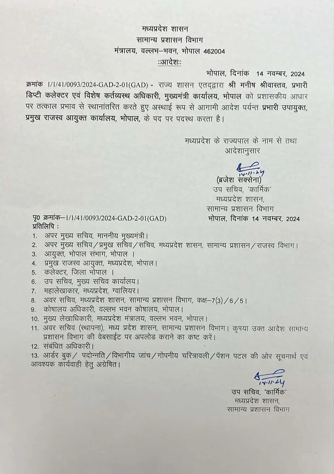 मध्य प्रदेश शासन सामान्य प्रशासन विभाग के उप सचिव बृजेश सक्सेना ने 14 नवंबर गुरुवार को जारी किए गए आदेश में राज्य शासन ने मनीष श्रीवास्तव प्रभारी डिप्टी कलेक्टर एवं विशेष कर्तव्यस्थ अधिकारी मुख्यमंत्री कार्यालय भोपाल को प्रशासनिक आधार पर तत्काल प्रभाव से स्थानांतरित करते हुए अस्थाई रूप से आगामी आदेश पर्यंत तक प्रभारी उपयुक्त प्रमुख राजस्व आयुक्त कार्यालय भोपाल में पदस्थ किया है।