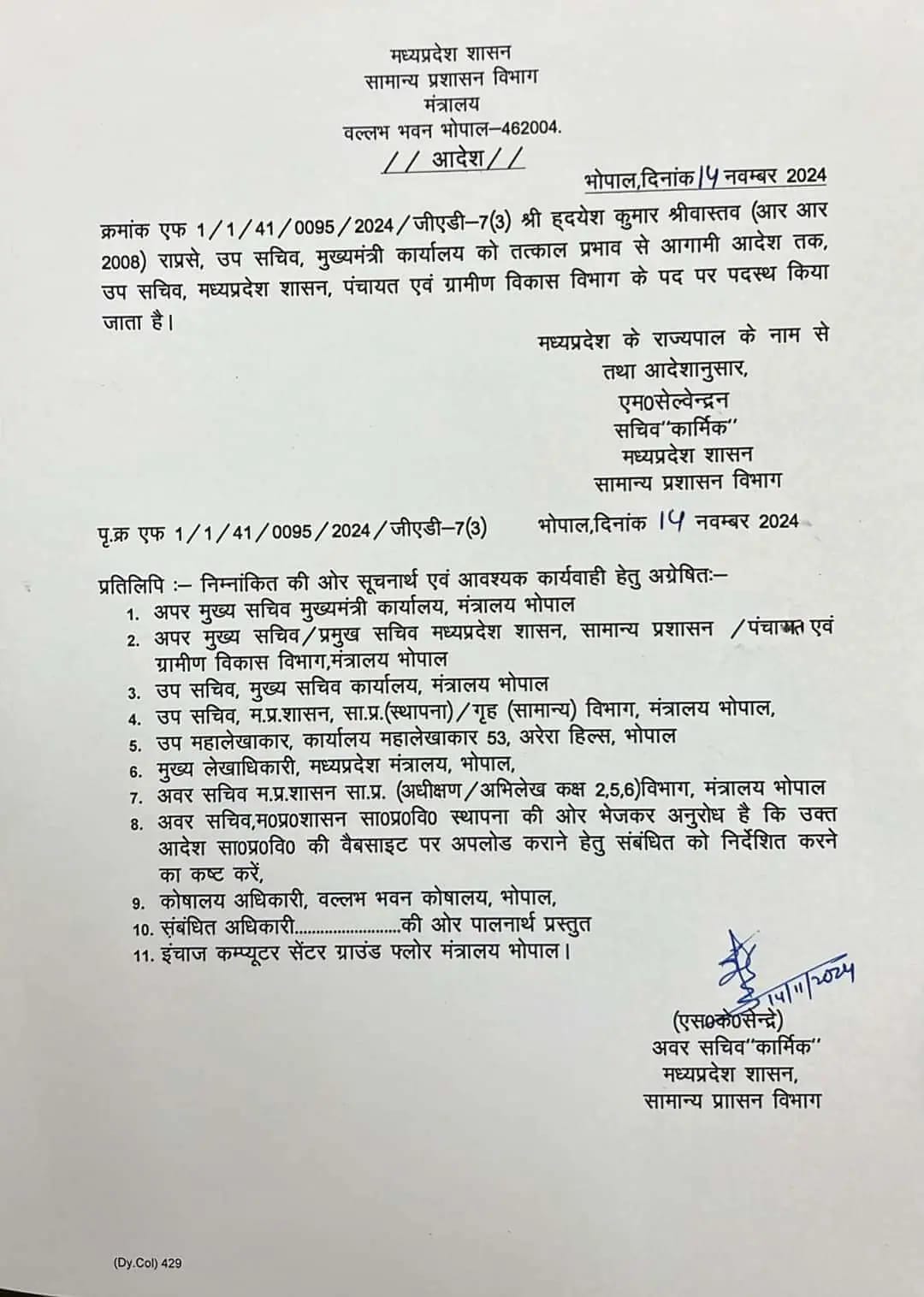 MP Transfer News: मध्य प्रदेश सामान्य प्रशासन विभाग ने राज्य प्रशासनिक सेवा अधिकारियों का तबादला किया है। मध्य प्रदेश शासन सामान्य प्रशासन विभाग के सचिन ने गुरुवार को जारी किए गए आदेश के मुताबिक ह्रदयेश कुमार श्रीवास्तव उप सचिव मुख्यमंत्री कार्यालय को तत्काल प्रभाव से आगामी आदेश तक उप सचिव मध्य प्रदेश शासन पंचायती एवं ग्रामीण विकास विभाग के पद पर पदस्थ किया है।