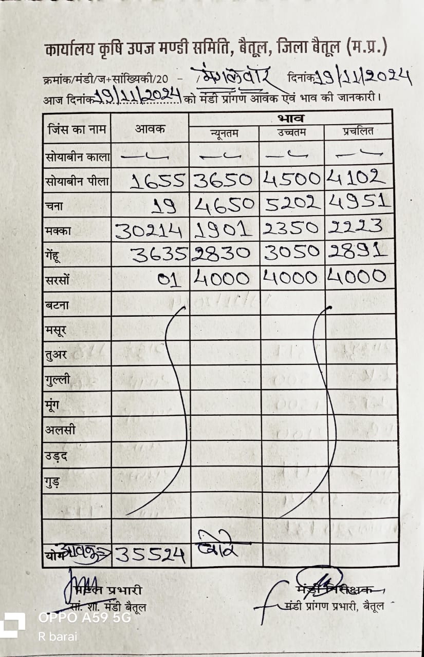 Betul Mandi Bhav 19 November 2024 : आज 19 नवम्बर 2024 के बैतूल मंडी भाव, 35 हजार बोरे रही उपज की आवक
