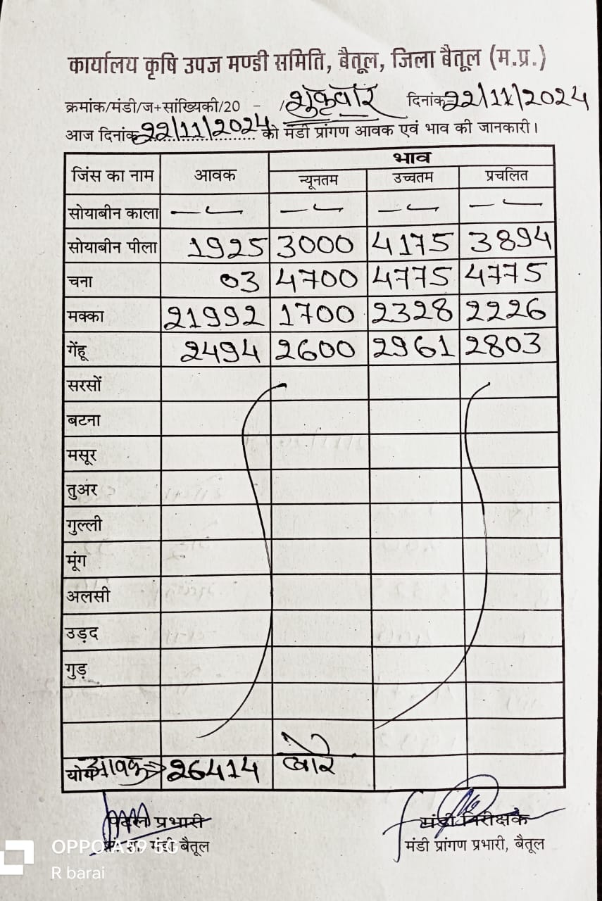 Betul Mandi Bhav 22 November 2024 : शुक्रवार को मंडी में खरीदी हुई। उपज के दामों में भी उतार चढ़ाव देखने को मिल रहा है। 22 नवम्बर 2024 को बैतूल मंडी में कुल उपज की आवक 26 हजार 413 बोरे रही। 2494 बोरे आवक गेंहू की आवक रही। सोयाबीन 1925 बोरे , मक्का 21992 बोरे आवक रही।