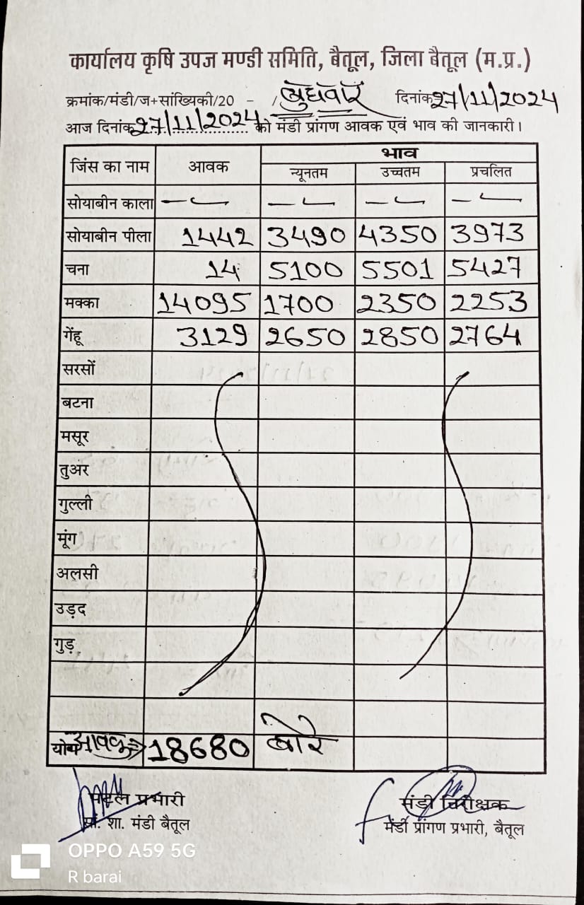 Betul Mandi Bhav 27 November 2024  : आज 27 नवम्बर 2024 के बैतूल मंडी भाव, जाने मक्का, गेंहू सोयाबीन के दाम