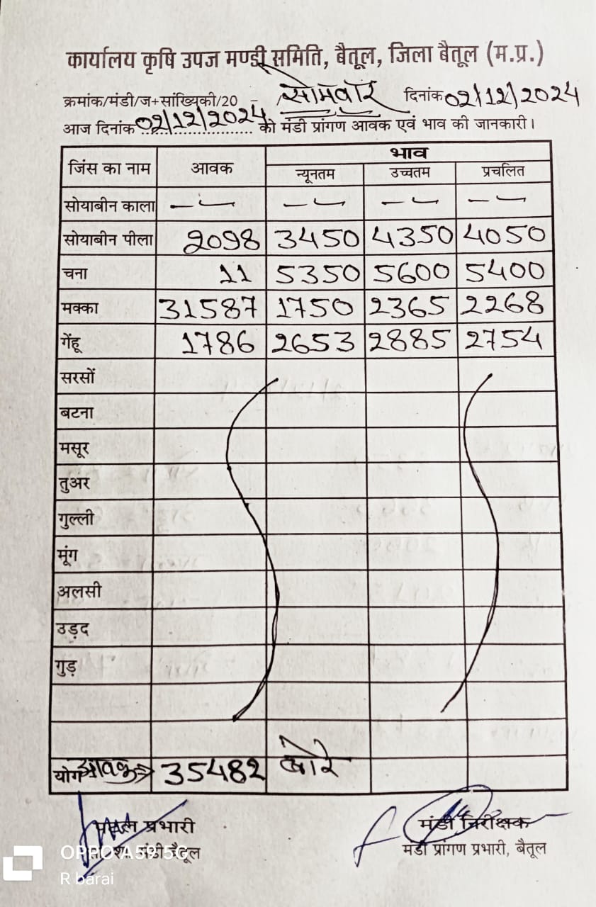Betul Mandi Bhav 02 December 2024 : आज 2 दिसंबर 2024 के बैतूल मंडी भाव, 35 हजार बोरे रही उपज की आवक