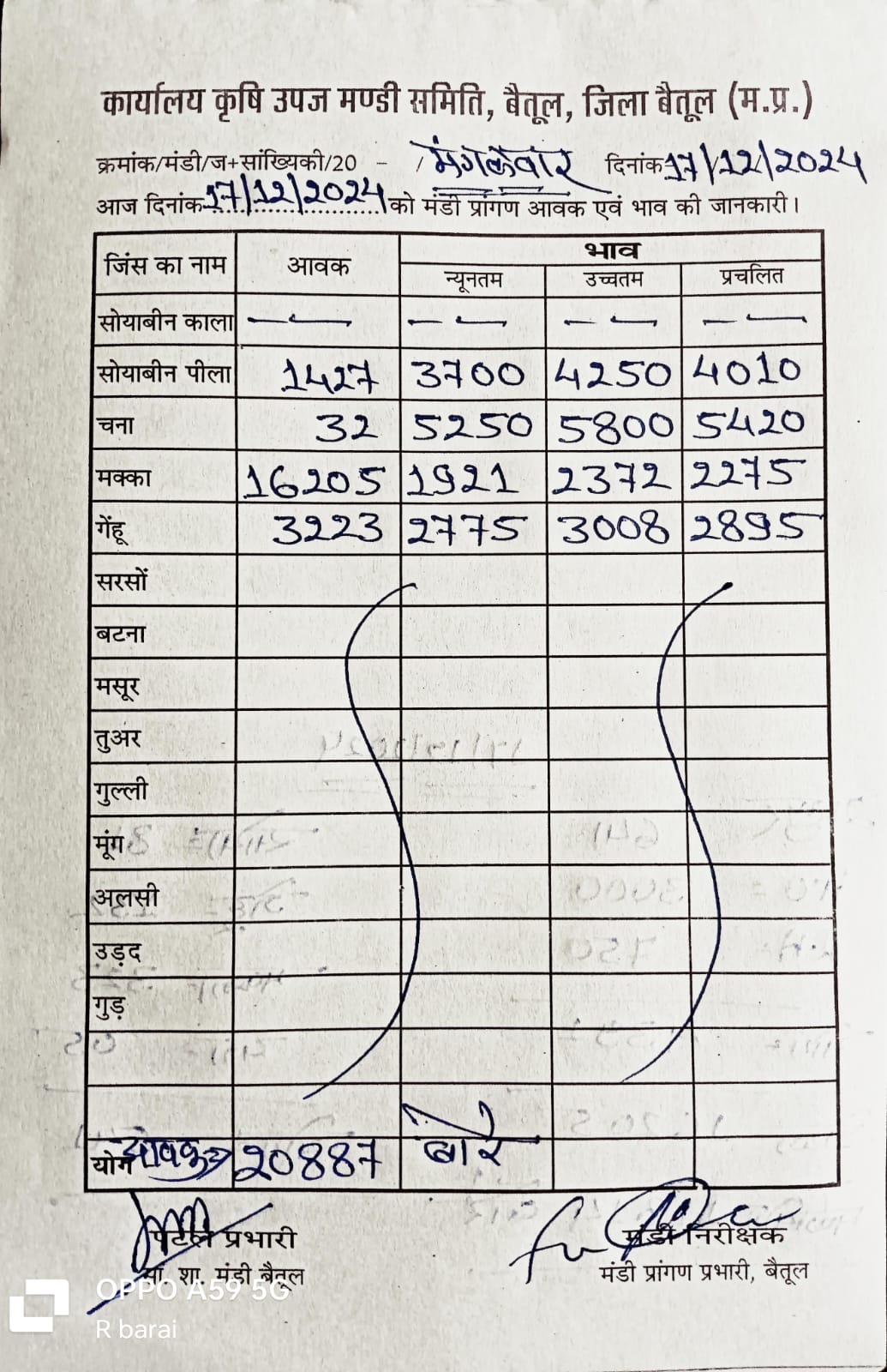 Betul Mandi Bhav 17 December 2024 : मंगलवार को मंडी में खरीदी हुई। उपज के दामों में भी उतार चढ़ाव देखने को मिल रहा है। 17 दिसंबर 2024 को बैतूल मंडी में कुल उपज की आवक 20 हजार 887 बोरे रही। 3223 बोरे आवक गेंहू की आवक रही। सोयाबीन 1427 बोरे , मक्का की आवक 16205 बोरे रही है।