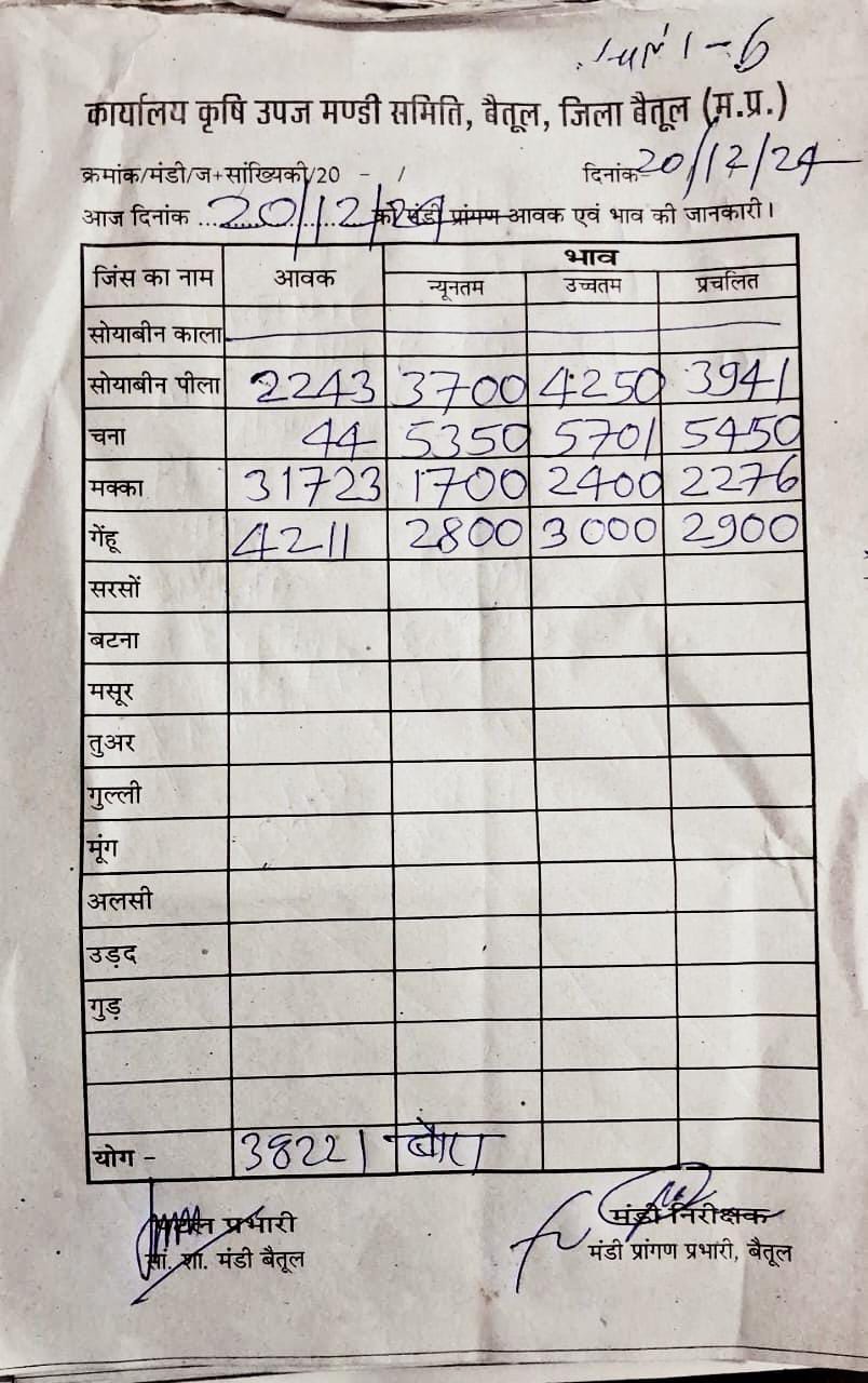 Betul Mandi Bhav 20 December 2024 : आज 20 दिसंबर 2024 के बैतूल मंडी भाव, उपज की रिकार्ड 38 हजार बोरे आवक