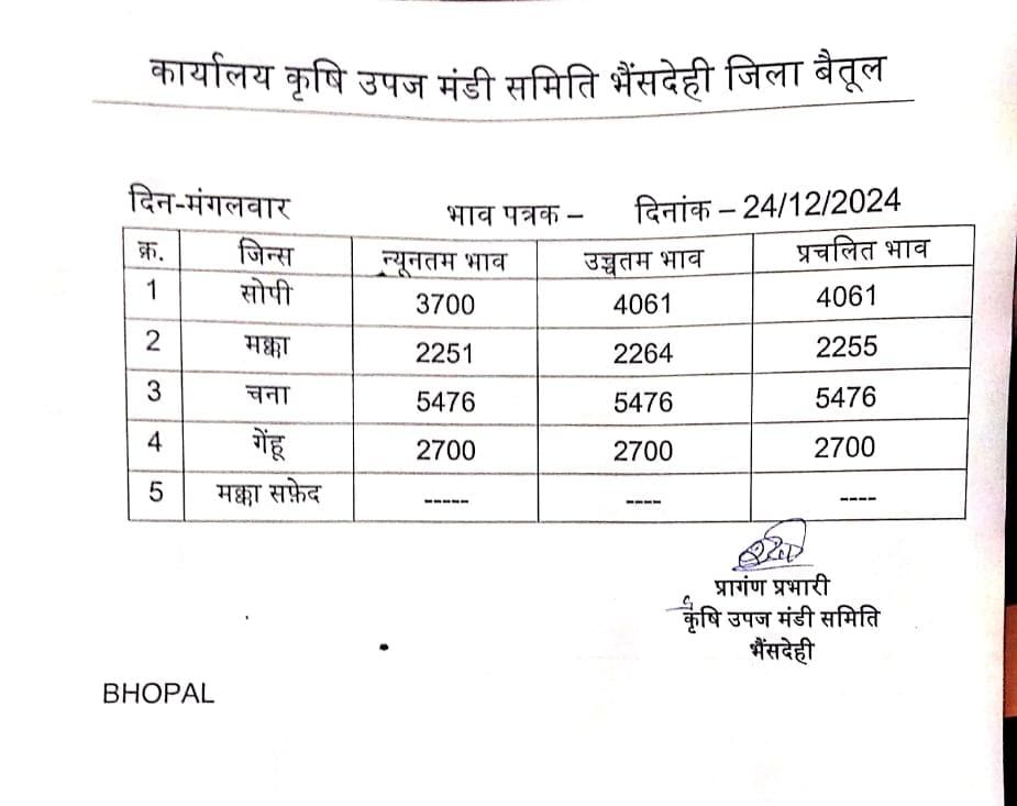 Betul Mandi Bhav 24 December 2024: आज 24 दिसंबर 2024 के बैतूल और भैंसदेही मंडी भाव, 23 हजार से अधिक बोरे रही आवक