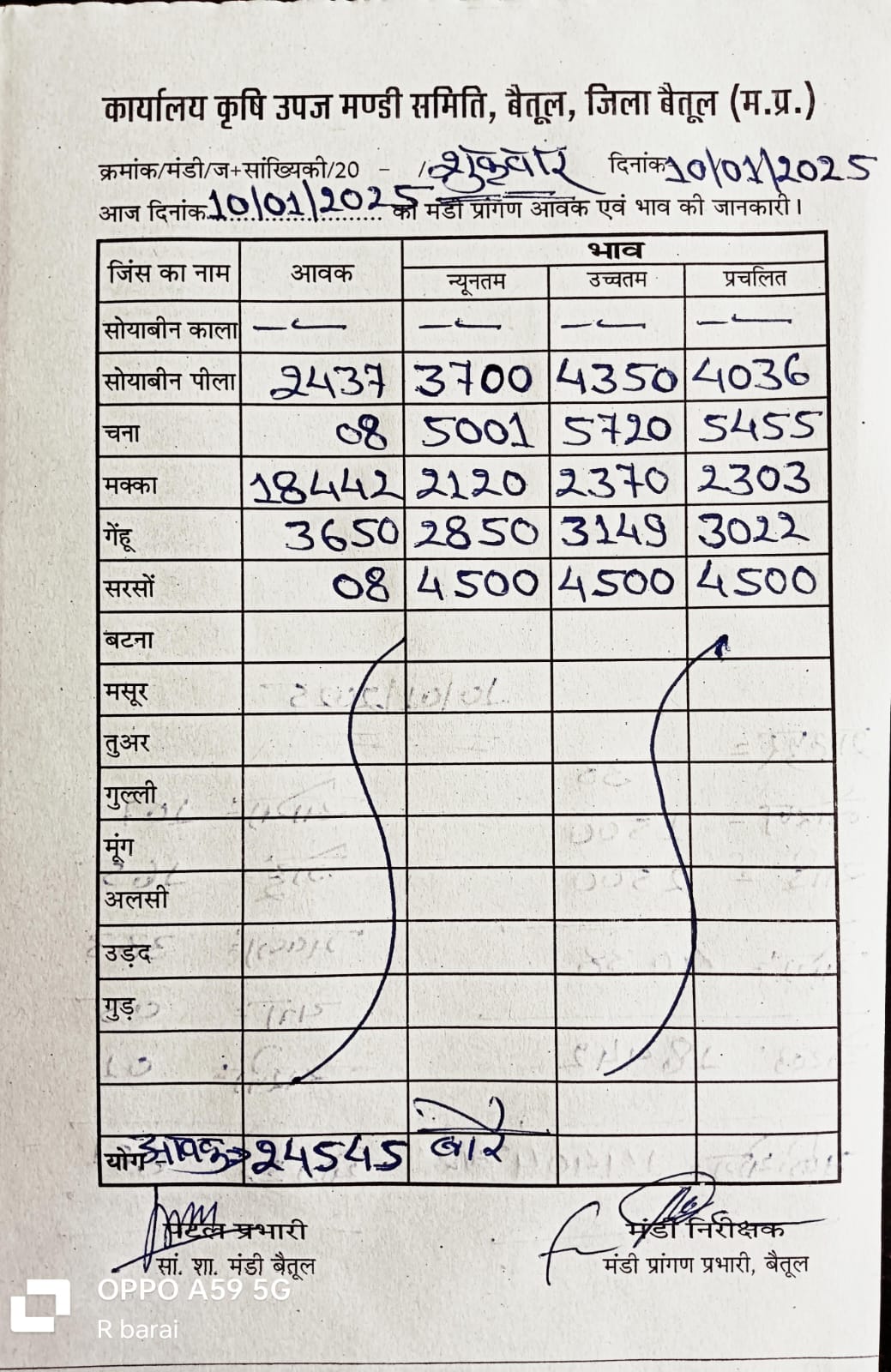 Betul Mandi Bhav 10 January 2025 : शुक्रवार को मंडी में खरीदी हुई। उपज के दामों में भी उतार चढ़ाव देखने को मिल रहा है। 10 जनवरी 2025 को बैतूल मंडी में कुल उपज की आवक 24 हजार 545 बोरे रही। 3650 बोरे आवक गेंहू की आवक रही। सोयाबीन 2437 बोरे , मक्का की आवक 18442 बोरे रही है। कृषि उपज मंडी में मक्का और गेहूं की सबसे ज्यादा आवक