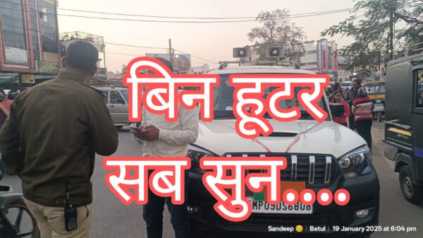 Betul Traffic Police:  गाड़ियों में हूटर लगाने पर प्रतिबंध होने के बावजूद भी लोग बड़े शौक से हूटर लगते हैं। कुछ लोगों को हूटर से इतनी मोहब्बत है कि जैसे किसी सुहागन महिला को मंगलसूत्र, बिछिया और पाजेब से नही होती होगी। हूटर ऐसे बजाते चलेंगे जैसे कि कोई मंत्री का काफिला आ रहा है। हूटर निकालने की कार्रवाई पर लोग भरे चौराहे पर पुलिस से ऐसे उलझते है जैसे उनके सिर से ताज छीन लिया हो।