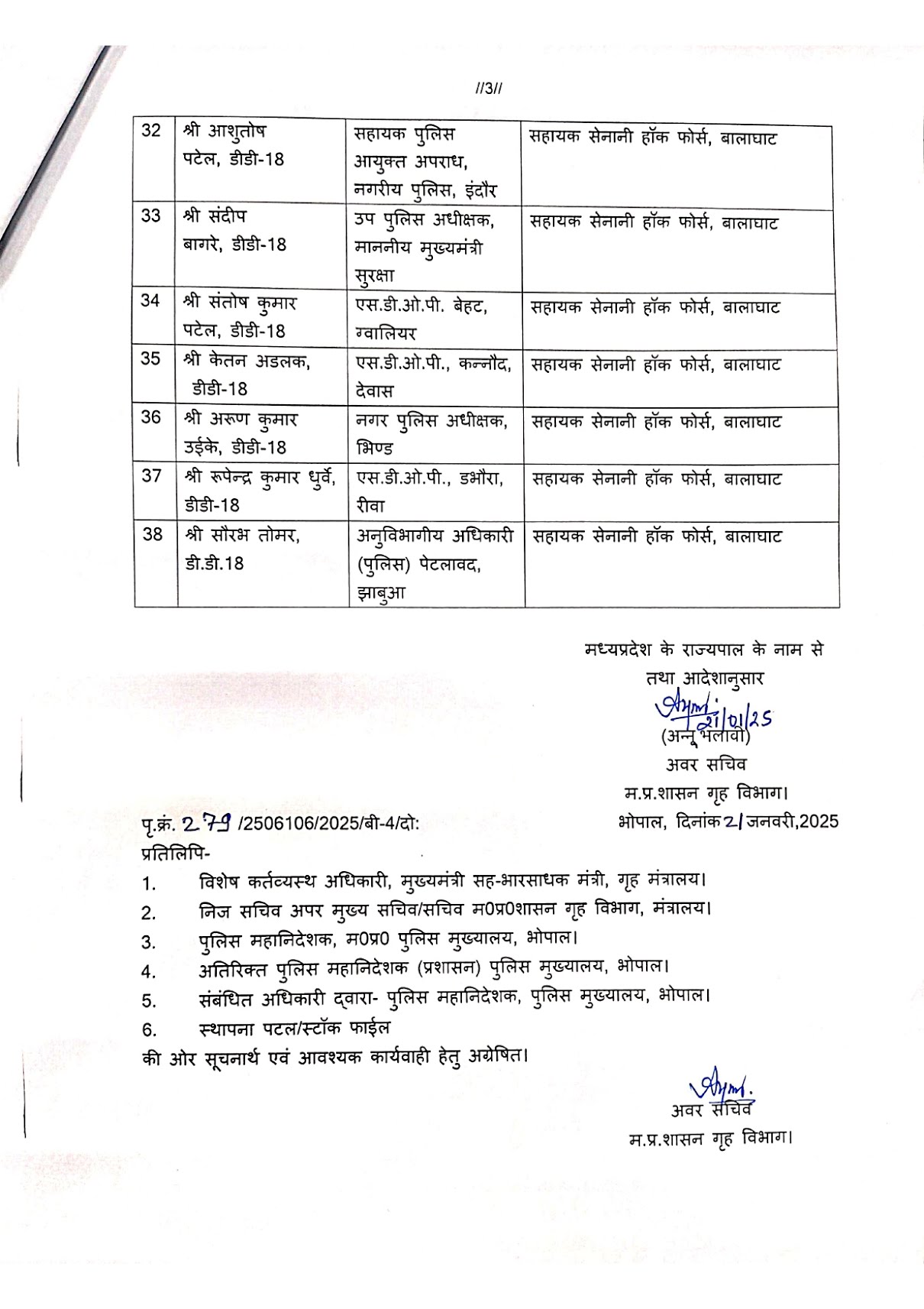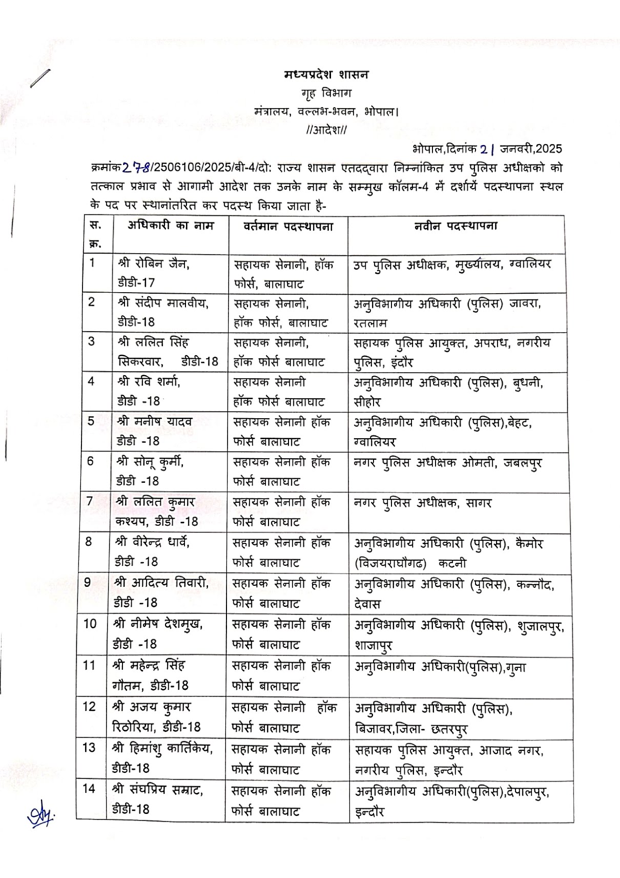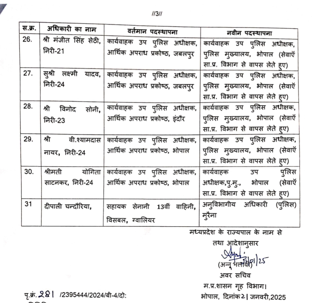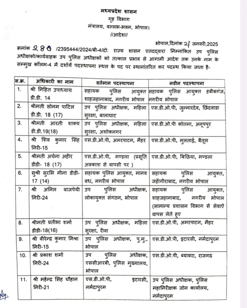 MP Police Transfer 2025 : मध्य प्रदेश सरकार ने थोक में पुलिस अधिकारियों के किये तबादले, जाने पूरी सूची