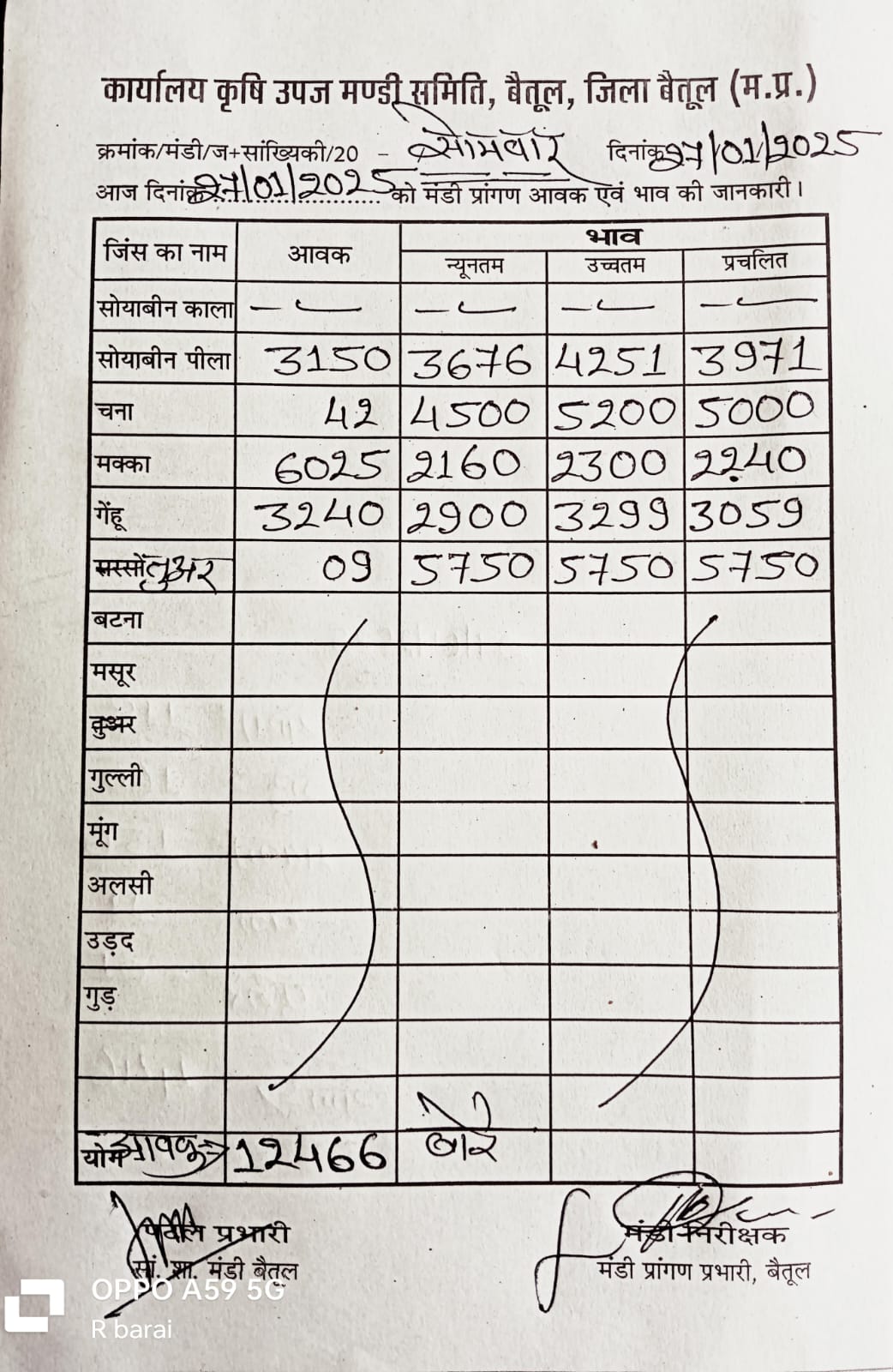 Betul Mandi Bhav 27 January 2025 : सोमवार को मंडी में खरीदी हुई। उपज के दामों में भी उतार चढ़ाव देखने को मिल रहा है। 27 जनवरी 2025 को बैतूल मंडी में कुल उपज की आवक 12 हजार 466 बोरे रही। 3240 बोरे आवक गेंहू की आवक रही। सोयाबीन 3150 बोरे , मक्का की आवक 6025 बोरे रही है।