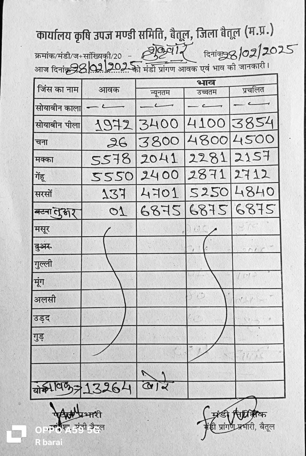 Betul Mandi Bhav 28 February 2025  : शुक्रवार  को मंडी में खरीदी हुई।  उपज के दामों में भी उतार चढ़ाव देखने को मिल रहा है। 28 फरवरी 2025  को बैतूल मंडी में कुल उपज की आवक 13 हजार 264 बोरे रही। 5550 बोरे आवक गेंहू की आवक रही। सोयाबीन 1972 बोरे , मक्का की आवक 5578 बोरे रही है।