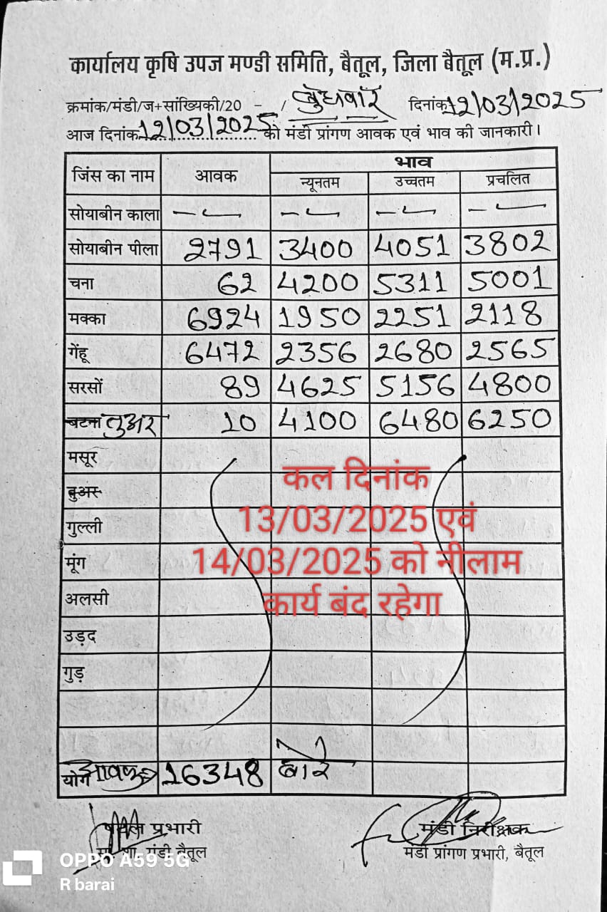 Betul Mandi Bhav 12 March 2025 : बुधवार को मंडी में खरीदी हुई। उपज के दामों में भी उतार चढ़ाव देखने को मिल रहा है। 12 मार्च 2025 को बैतूल मंडी में कुल उपज की आवक 16 हजार 348 बोरे रही। 6472 बोरे आवक गेंहू की आवक रही। सोयाबीन 2791 बोरे , मक्का की आवक 6924 बोरे रही है। कृषि उपज मंडी में मक्का और गेहूं की सबसे ज्यादा आवक