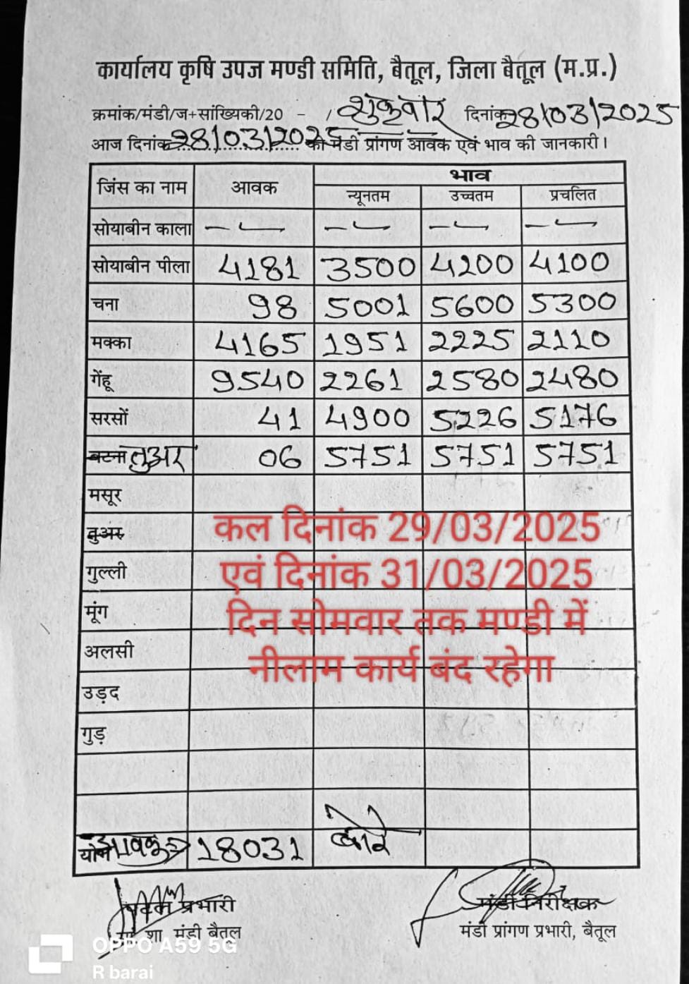 Betul Mandi Bhav 28 March 2025 : आज 28 मार्च 2025 के बैतूल मंडी भाव, आगामी दो दिन बंद रहेगी खरीदी