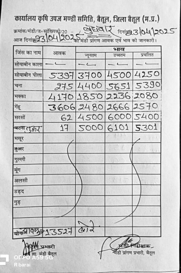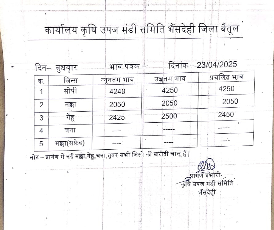Betul Mandi Bhav 23 April 2025 : आज 23 अप्रैल 2025 के बैतूल और भैंसदेही मंडी भाव, 13 हजार बोरे रही आवक