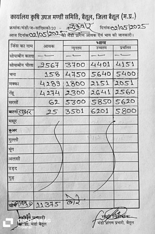 Betul Mandi Bhav 02 May 2025 : आज 02 मई 2025 के बैतूल मंडी भाव, 11 हजार बोरे रही उपज की आवक