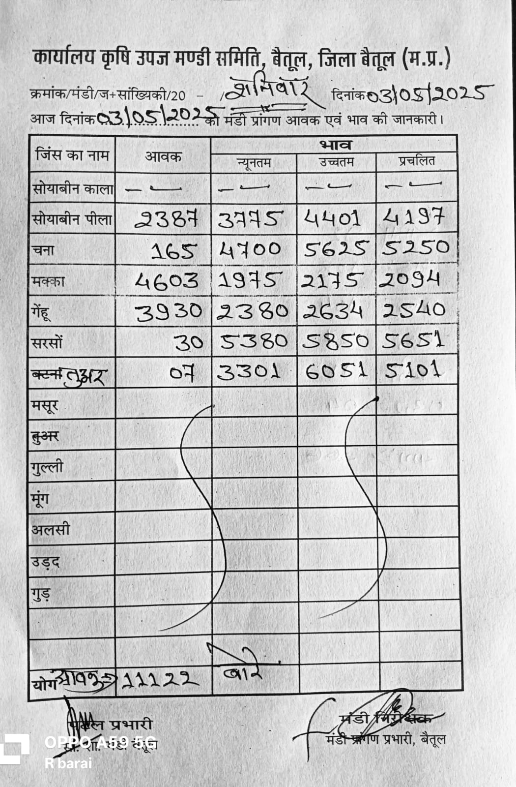 Betul Mandi Bhav 03 May 2025  : शनिवार  को मंडी में खरीदी हुई।  उपज के दामों में भी उतार चढ़ाव देखने को मिल रहा है। 03 मई 2025  को बैतूल मंडी में कुल उपज की आवक 11 हजार 122 बोरे रही। 3930 बोरे आवक गेंहू की आवक रही। सोयाबीन की 2387 बोरे , मक्का की आवक 4603 बोरे रही है।