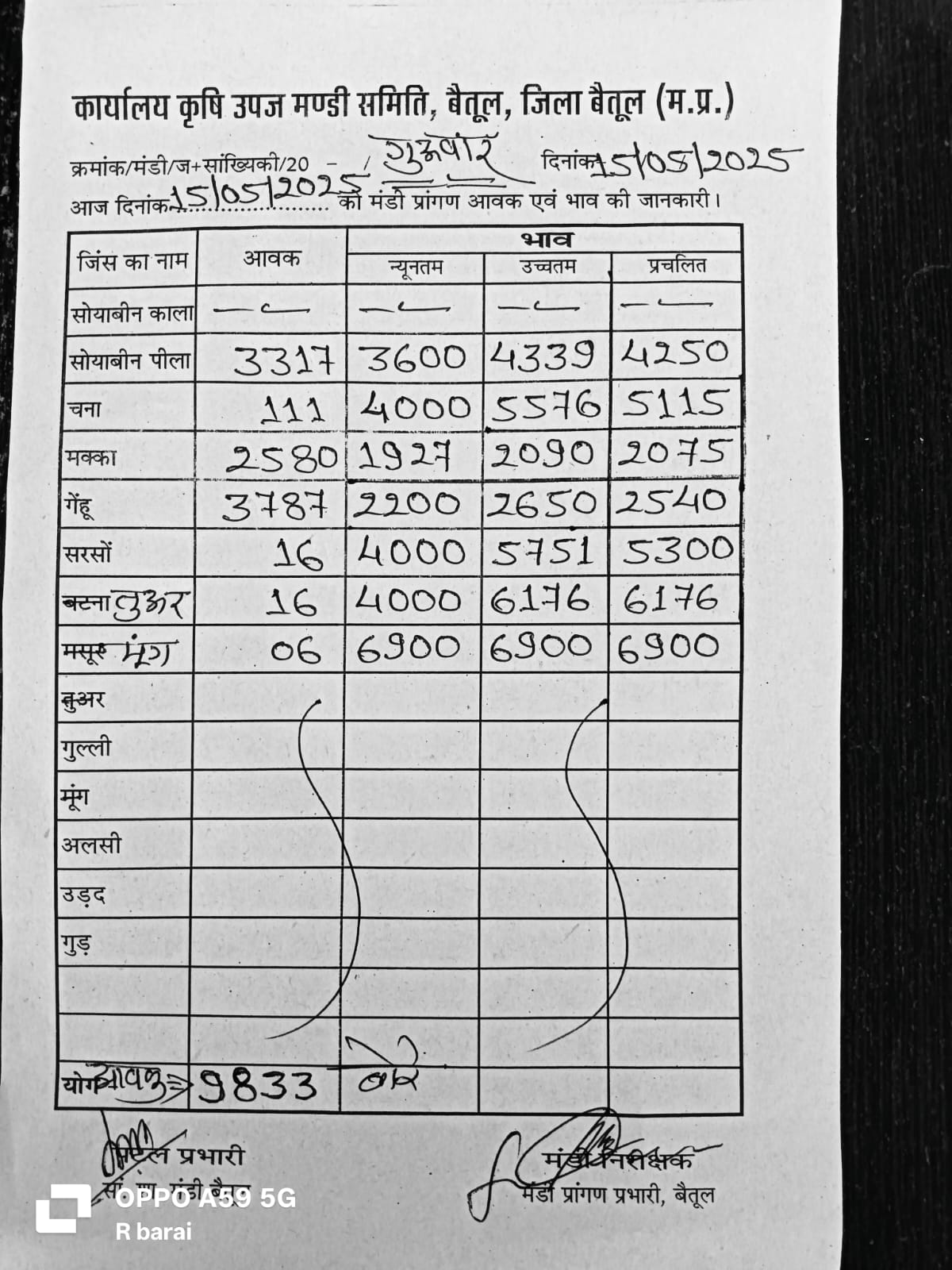 Betul Mandi Bhav 15 May 2025 : गुरुवार को मंडी में खरीदी हुई। उपज के दामों में भी उतार चढ़ाव देखने को मिल रहा है। 15 मई 2025 को बैतूल मंडी में कुल उपज की आवक 09 हजार 833 बोरे रही। 3787 बोरे आवक गेंहू की आवक रही। सोयाबीन की 3317 बोरे , मक्का की आवक 2580 बोरे रही है। कृषि उपज मंडी में मक्का और गेहूं की सबसे ज्यादा आवक