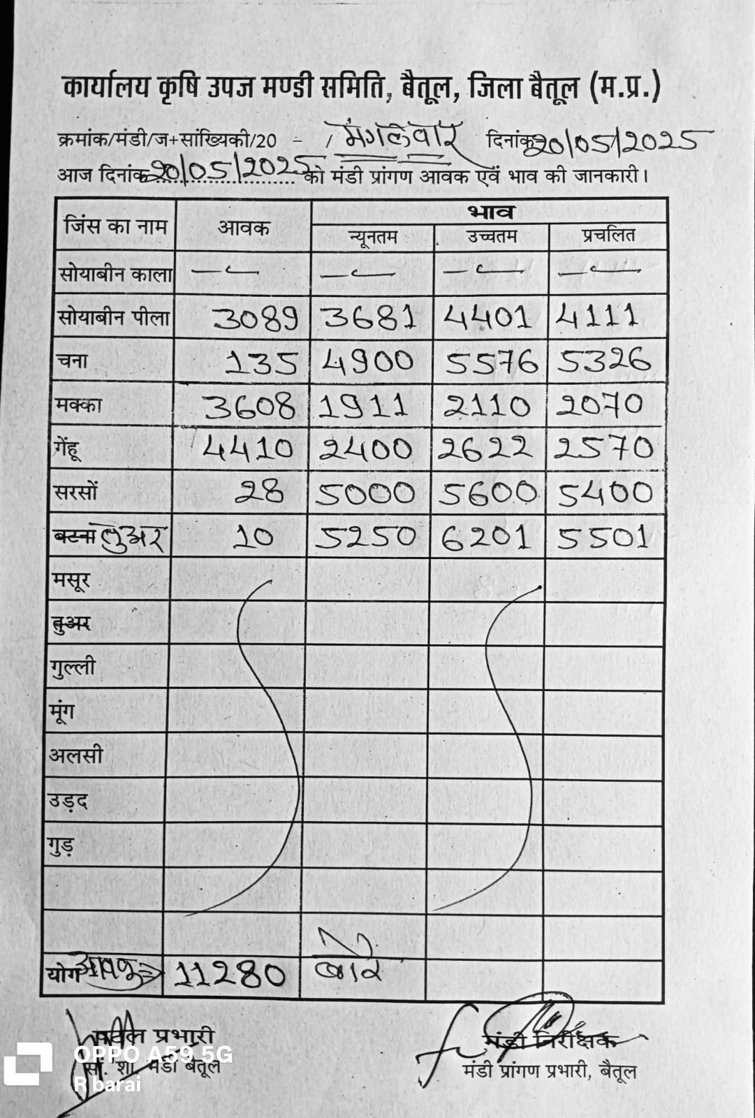 Betul Mandi Bhav 20 May 2025 : आज 20 मई 2025 के बैतूल मंडी भाव, 11 हजार बोरे रही उपज की आवक
