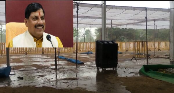 MP Today News : स्वसहायता समूहों के सम्मेलन और विकास कार्यों के भूमिपूजन व लोकार्पण कार्यक्रम में आ रहे प्रदेश के मुख्यमंत्री मोहन यादव बैतूल जिले के सारणी बगडोना में जनसभा को संबोधित करेंगे। मुख्यमंत्री के कार्यक्रम के एक दिन पहले मंगलवार को सारणी में झमाझम बारिश हुई। बारिश के कारण व्यवस्था प्रभावित हुई है। कार्यक्रम में लगा टेंट भी गीला हो गया है। बारिश को देखते हुए वाटरप्रूफ टेंट लगाया गया है।