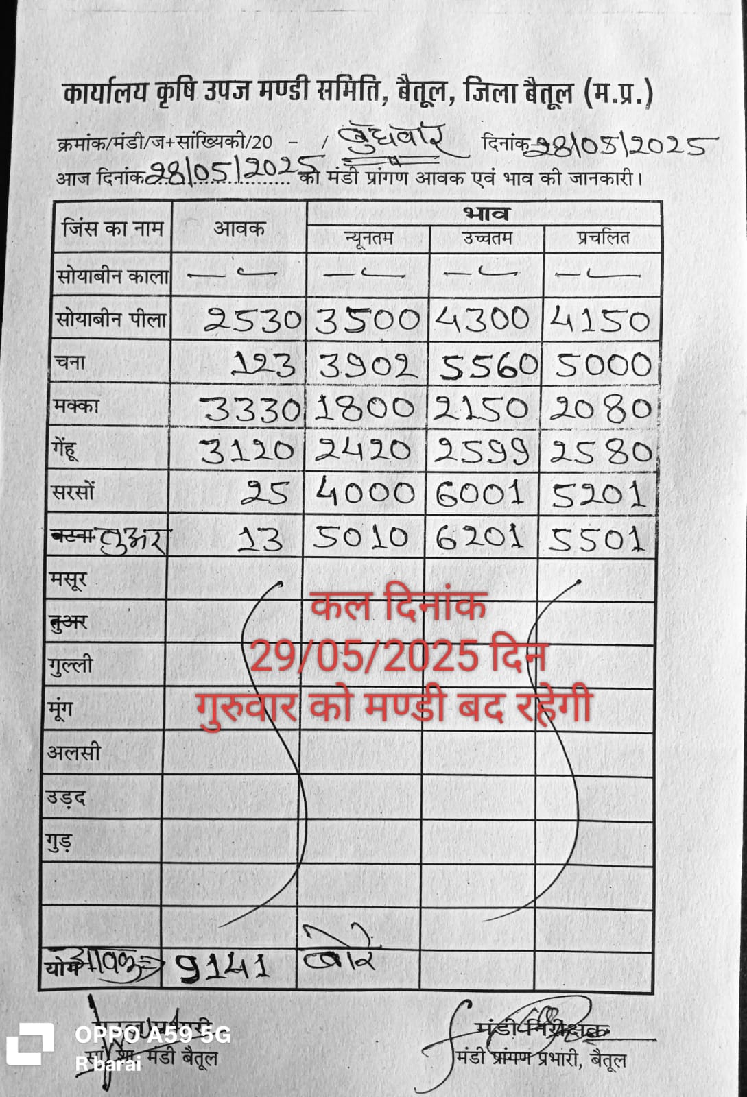 Betul Mandi Bhav 28 May 2025 : 28 मई 2025 के बैतूल मंडी भाव, कल खरीदी रहेगी बंद