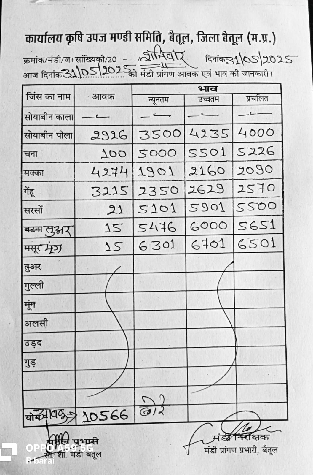 Betul Mandi Bhav 31 May 2025 : आज 31 मई 2025 के बैतूल मंडी भाव, 10 हजार बोरे रही उपज की आवक