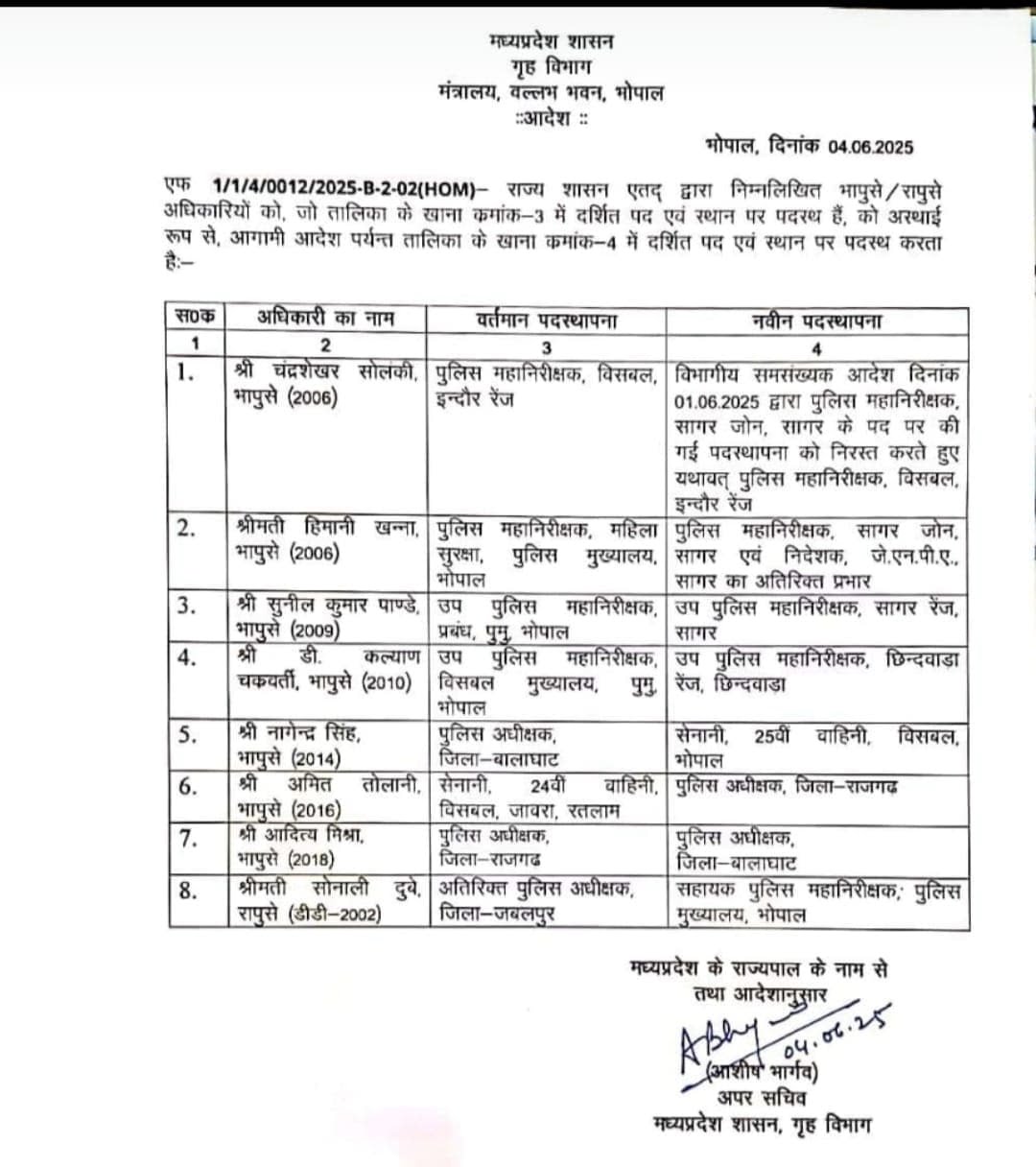 MP IPS Transfer : मध्य प्रदेश सरकार में आठ आईपीएस अधिकारियों का तबादला कर दिया है। इसका बदला सूची में राजगढ़ और बालाघाट के भी एसपी बदले गए है। मध्य प्रदेश ग्रह विभाग के अपर सचिव आशीष भार्गव द्वारा जारी किए गए आदेश में 8 IPS अधिकारीयो को स्थानांतरित किया है।