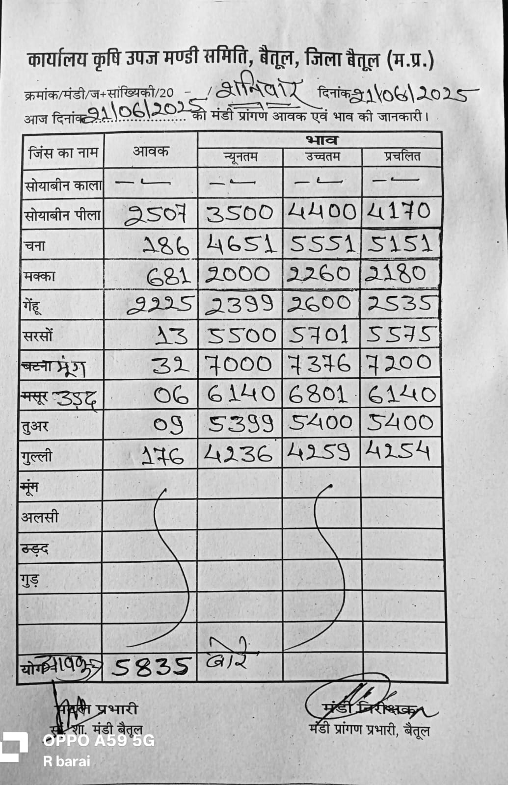 Betul Mandi Bhav 21 Jun 2025 : आज 21 जून 2025 के बैतूल मंडी भाव, 5 हजार बोरे रही उपज की आवक