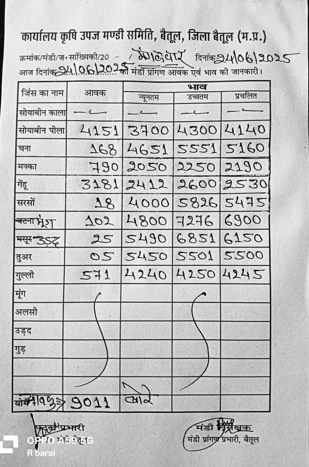 Betul Mandi Bhav 24 Jun  2025  : आज 24 जून 2025 के बैतूल मंडी भाव, 09 हजार बोरे रही आवक