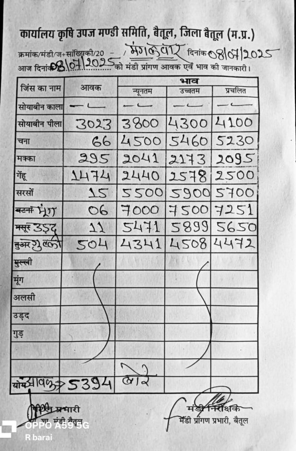 Betul Mandi Bhav 08 July  2025  : आज 08 जुलाई 2025 के बैतूल मंडी भाव, 5 हजार बोरे रही उपज की आवक