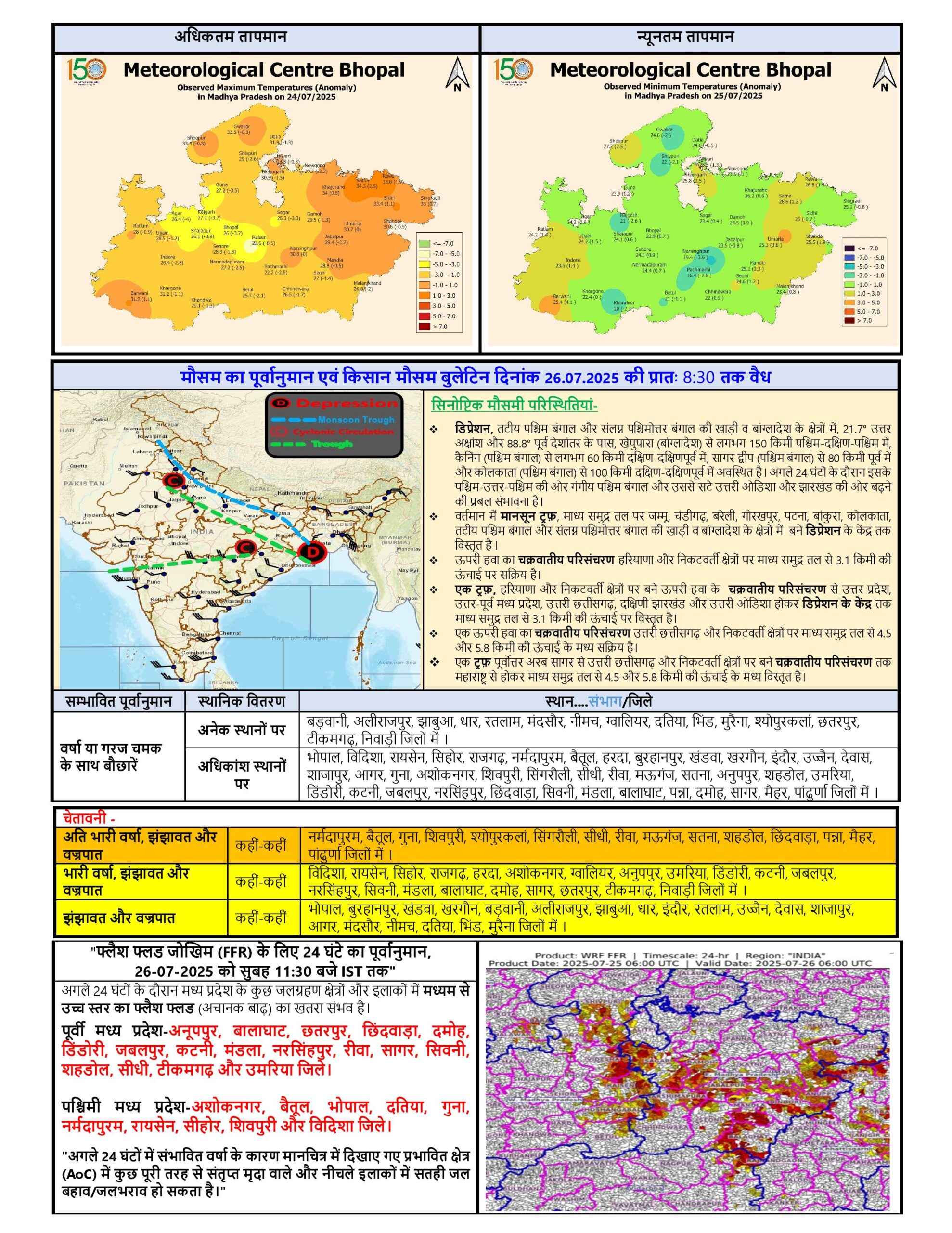मौसम विभाग भोपाल के मुताबिक विदिशा, रायसेन, सिहोर, राजगढ़, हरदा, अशोकनगर, ग्वालियर, अनुपपुर, उमरिया, डिंडोरी, कटनी, जबलपुर, नरसिंहपुर, सिवनी, मंडला, बालाघाट, दमोह, सागर, छतरपुर, टीकमगढ़, निवाड़ी जिलों में।भोपाल, बुरहानपुर, खंडवा, खरगौन, बड़वानी, अलीराजपुर, झाबुआ, धार, इंदौर, रतलाम, उज्जैन, देवास, शाजापुर,आगर, मंदसौर, नीमच, दतिया, भिंड, मैना जिलों में बारिश की सभावना बनी है।