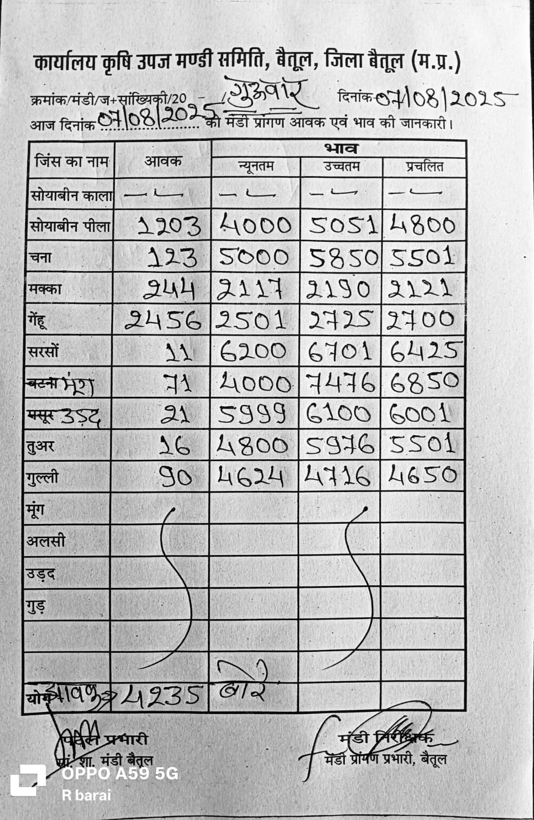 📅 दिनांक: 07 अगस्त 2025 ( गुरुवार Betul Mandi Bhav 07 August 2025)