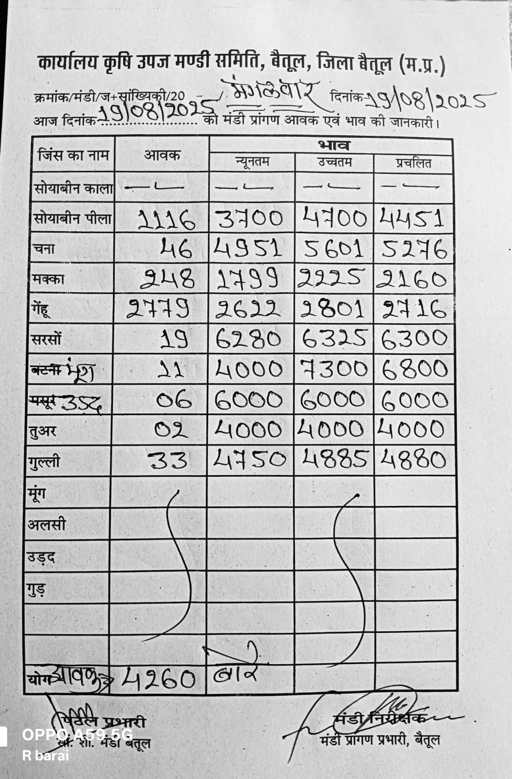 📅 दिनांक: 19 अगस्त 2025 ( सोमवार Betul Mandi Bhav 19 August 2025)