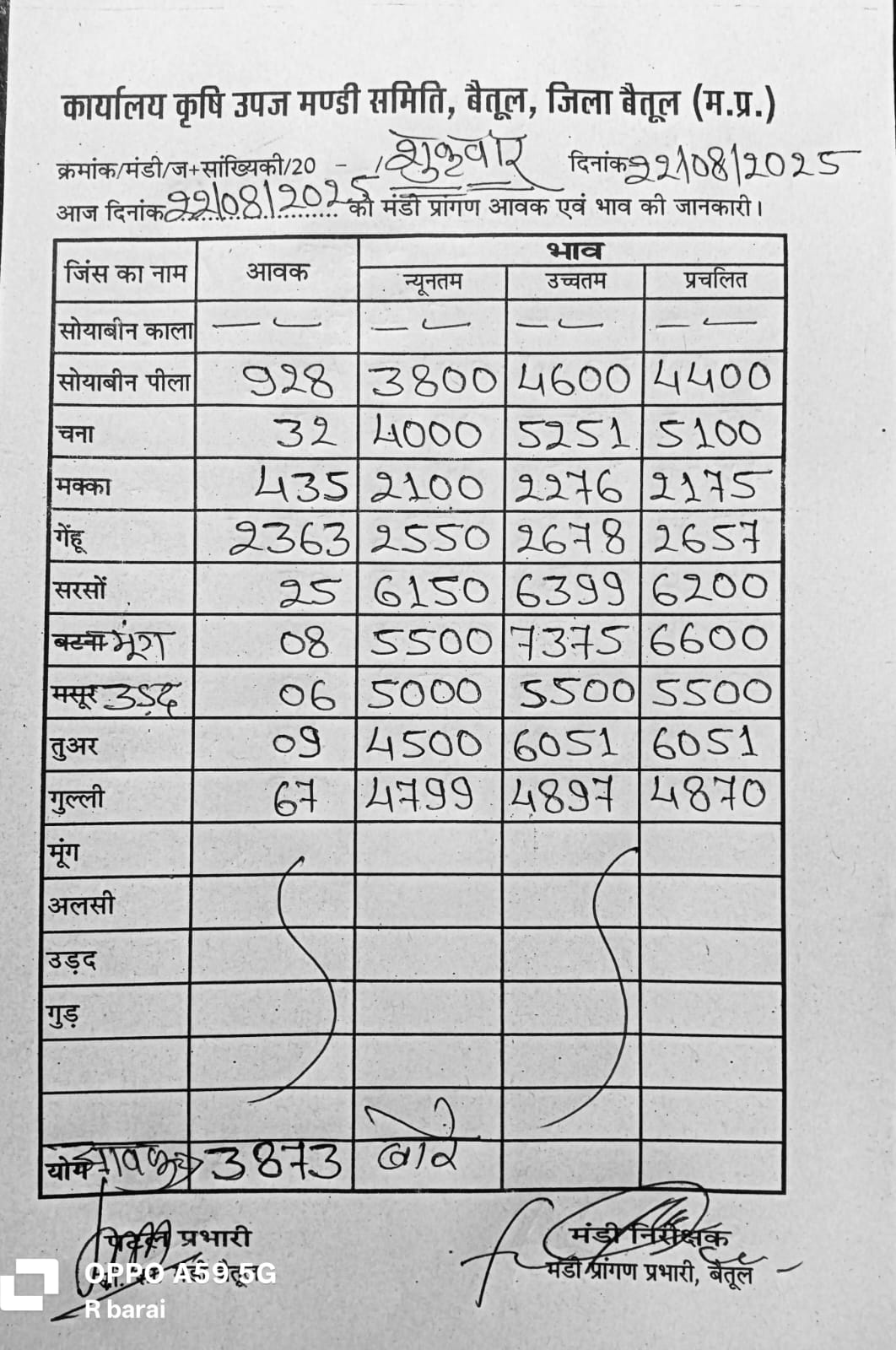 Betul Mandi Bhav 22 August 2025 : आज 22 अगस्त 2025 के बैतूल मंडी भाव, 3873 बोरे रही उपज की आवक