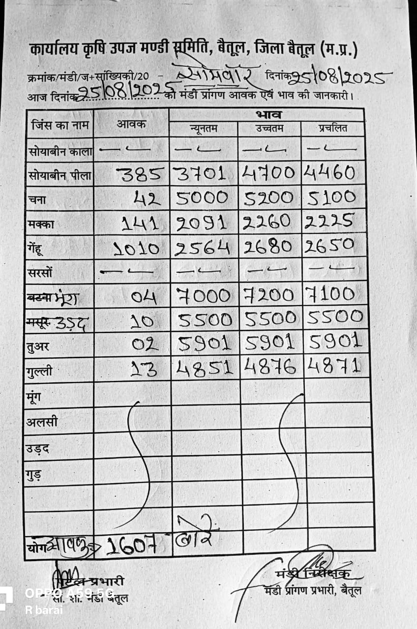 Betul Mandi Bhav 25 August 2025 : आज 25 अगस्त 2025 के बैतूल मंडी भाव , उपज की आवक में आई भारी कमी