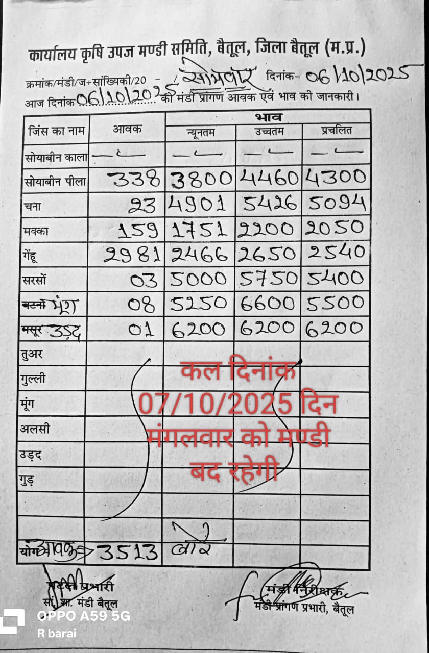 Betul Mandi Bhav 06 October 2025  : आज 06 अक्टूबर 2025 के बैतूल मंडी भाव, 3 हजार बोरे रही उपज की आवक, कल खरीदी रहेगी बंद