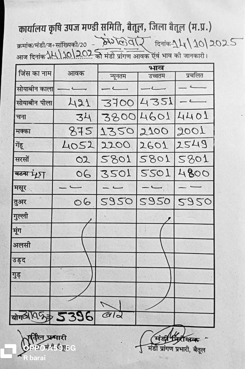 Betul Mandi Bhav 14 October 2025 : मंगलवार को बैतूल मंडी में खरीदी हुई। उपज के दामों में भी उतार चढ़ाव देखने को मिल रहा है। 14 अक्टूबर 2025 को बैतूल मंडी में कुल उपज की आवक 5 हजार 396 बोरे रही। 4052 बोरे आवक गेंहू की आवक रही। सोयाबीन की 421 बोरे मक्का की आवक 875 बोरे रही है। कृषि उपज मंडी में गेंहू, और सोयाबीन सबसे ज्यादा आवक