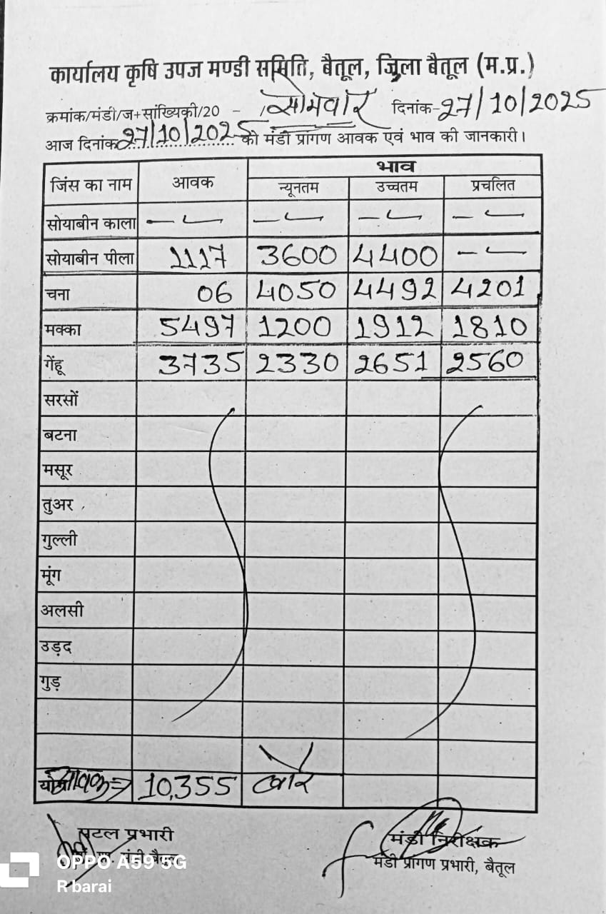 Betul Mandi Bhav 27 October 2025 : सोमवार को बैतूल मंडी में खरीदी हुई। उपज के दामों में भी उतार चढ़ाव देखने को मिल रहा है। 27 अक्टूबर 2025 को बैतूल मंडी में कुल उपज की आवक 10 हजार 355 बोरे रही। 3735 बोरे आवक गेंहू की आवक रही। सोयाबीन की 1117 बोरे मक्का की आवक 5497 बोरे रही है। कृषि उपज मंडी में गेंहू, और सोयाबीन सबसे ज्यादा आवक
